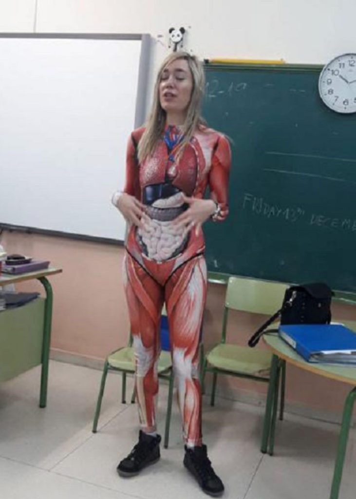 Při jedné z hodin anatomie si tedy učitelka oblékla těsný kostým s otiskem lidských orgánů. Udělala to nejen proto, aby na sebe upozornila, ale také aby ukázala, jak funguje lidské tělo.