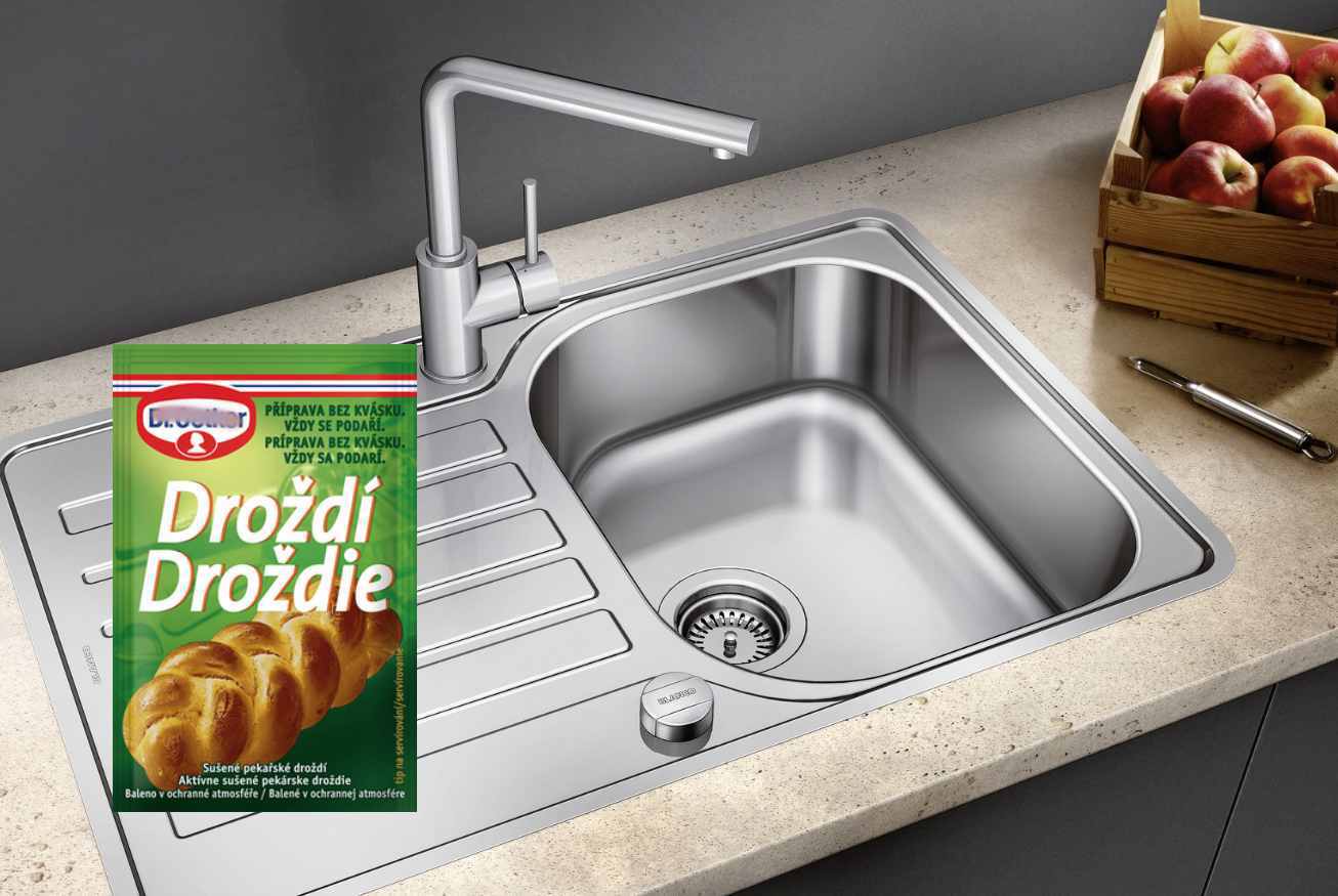 Rozkrojte citron na čtvrtiny a šťávou důkladně potřete celý dřez . Nechte 5 minut působit. Nyní nalijte ocet do lahve s rozprašovačem přes trychtýř, nasypte sušené kvasnice, uzavřete a důkladně protřepejte. Tímto roztokem postříkejte celý dřez. Nechte působit 15 minut. Poté vezměte zubní kartáček a každý kus důkladně vydrhněte.