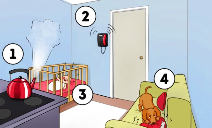 Na obrázku vidíme varnou konvici, kterou je třeba vypnout, zvonící telefon, který je třeba zvednout, plačící dítě, které je třeba utěšit, a psa, kterého je třeba utratit, protože trhá polštář. Co uděláte jako první?