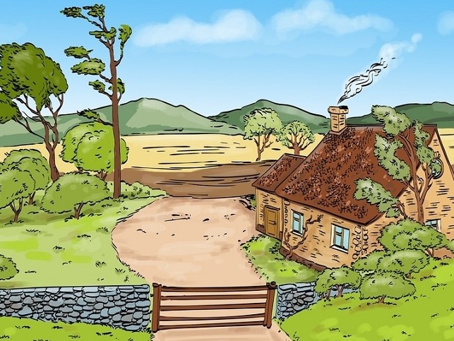 Na obrázku je vyobrazen typický vesnický domek. Na pozadí můžete vidět kopce a louky, před domem se nachází brána, kamenná stěna a několik stromů. Něco tu však není v pořádku. Vaším úkolem je zjistit, co to je!