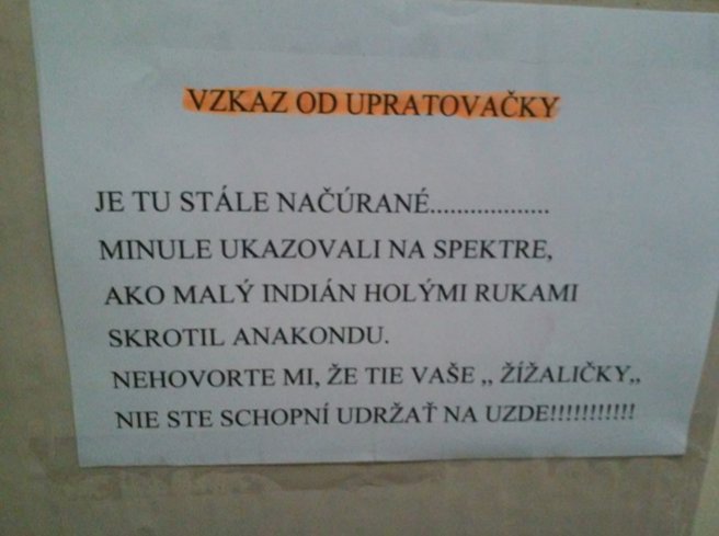 Kreativita lidí na Slovensku nezná hranic. Nejnověji to dokázala paní uklízečka z pracoviště jednoho posluchače rádiové relace, která svým vzkazem u pisoárů pobavila opravdu celé Slovensko.