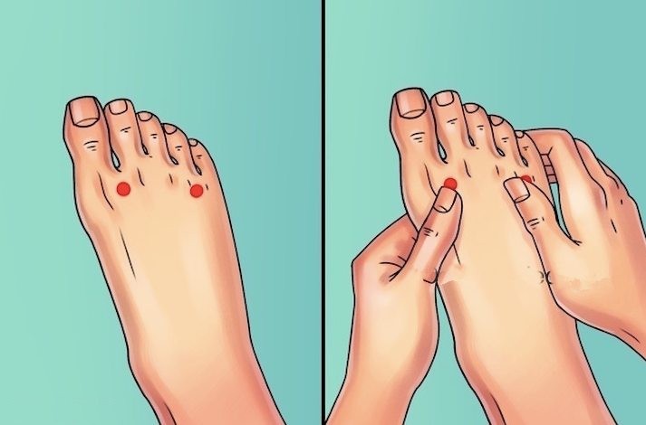 Pokud vás po dlouhém dni bolí nohy, umístěte palce obou rukou na body zobrazené na obrázku (mezi 1. a 2. prst a mezi 4. a 5 prst na noze, přibližně 1 cm od kořene prstů.