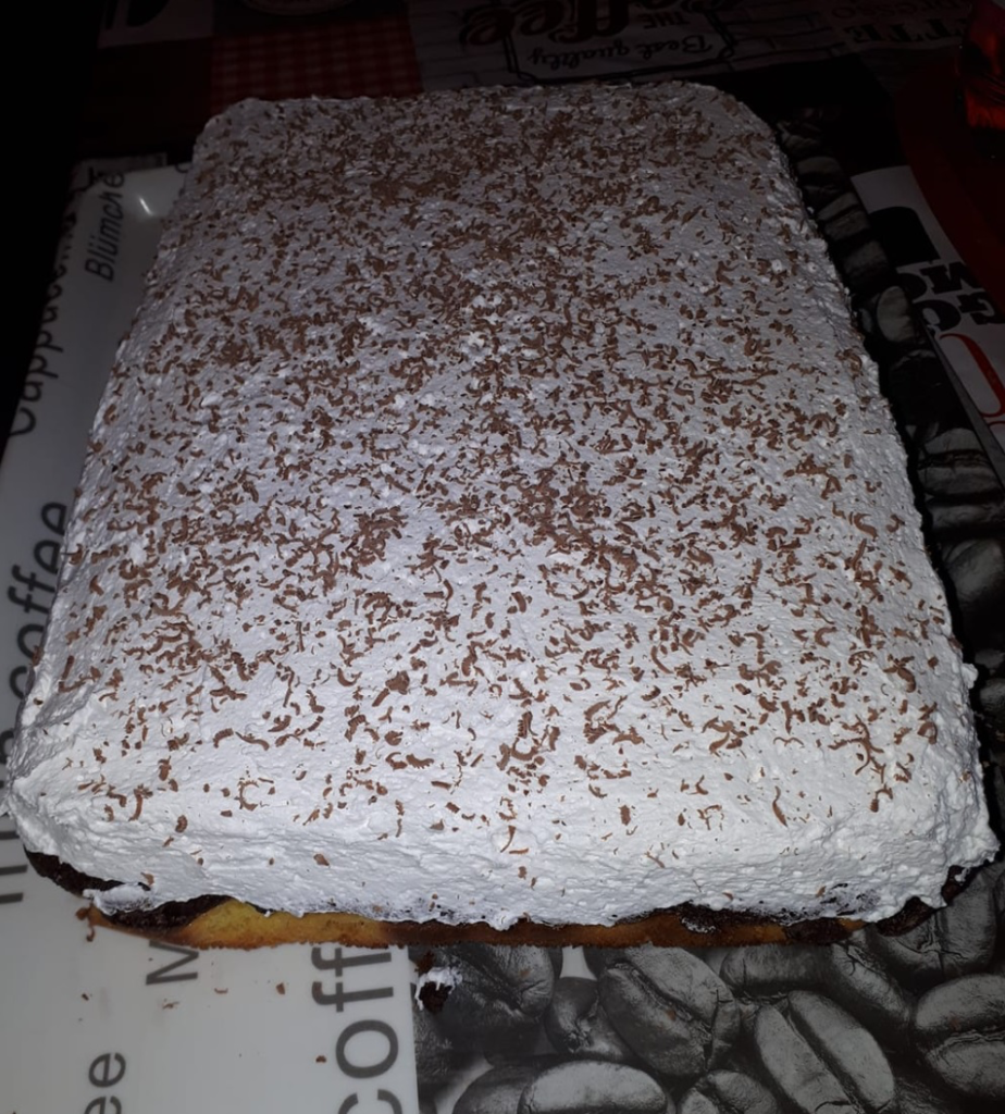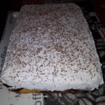 • Dokončení: Po upečení nechte koláč vychladnout. Poté vyšlehejte 2,5 dl smetany a rovnoměrně ji rozetřete na krém. Na závěr ozdobte čokoládovými hoblinkami.