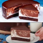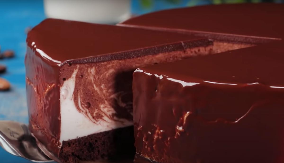 • Poleva Ve vodní lázni nebo mikrovlnce rozehřejeme čokoládu s máslem. Dort vyjmeme z formy, obložíme okraje pečicím papírem a polijeme čokoládovou polevou. Rozetřeme ji rovnoměrně po povrchu a necháme chladit dalších 30 minut.