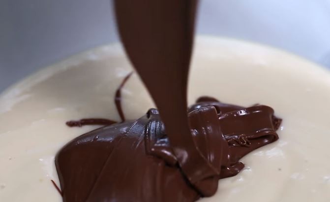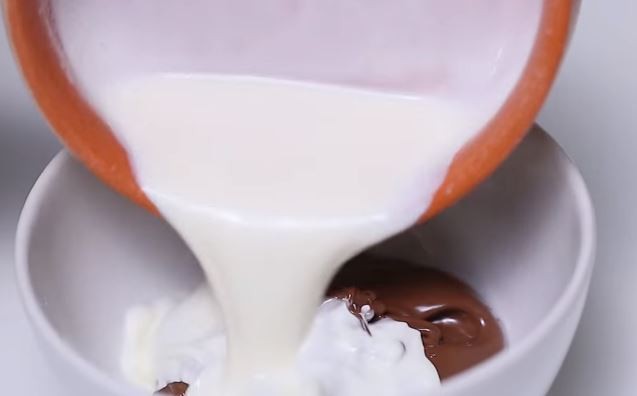 - Příprava polevy: V menším hrnci zahřejte smetanu a přidejte nutellu. Míchejte, dokud se vše nespojí.