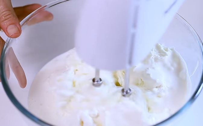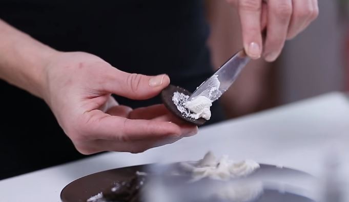 - Příprava vrstvy s nutellou: 1/3 tvarohové směsi přeložte do jiné misky a přidejte 2 lžičky nutelly a 1 lžičku smetany. Promíchejte.