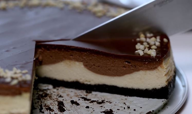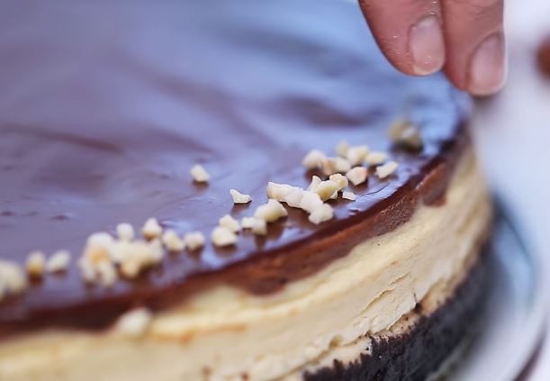 - Finální úprava: Polevou přelijte cheesecake, zakryjte fólií a nechte v ledničce přes noc. Pro extra chuť můžete cheesecake posypat nasekanými lískovými ořechy.
