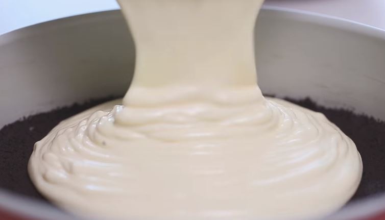 - Sestavení cheesecaku: Na korpus nalijte 2/3 tvarohové směsi, poté opatrně vlijte třetinu směsi s nutellou.