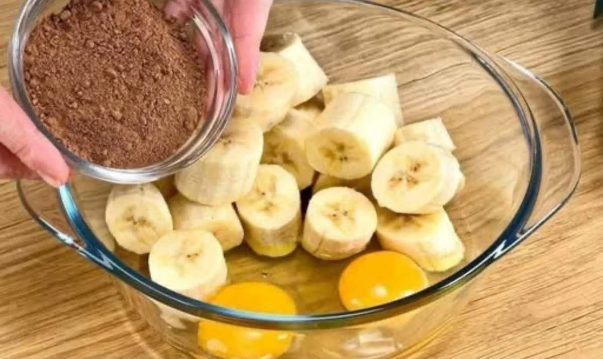 • Suché suroviny Do samostatné mísy prosejte mouku, kakao, prášek do pečiva, jedlou sodu a sůl. Poté je postupně přidejte k banánové směsi.