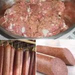 • Příprava směsi: Maso a slaninu umeleme nahrubo. Přidáme česnek, sůl, koření a vodu. Vše důkladně promícháme, dokud směs není jednolitá a pružná.