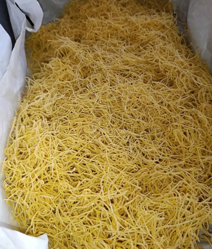 Domácí vaječné nudle z 10 vajec a 1 kg mouky jsou díky jednoduchému postupu i krátkému odpočinku v těstě rychle připravené. Jejich konzistence je vláčná, sušení jen pár desítek minut postačí a výsledné nudle přinesou do vaší kuchyně chuť pravé domácí speciality.