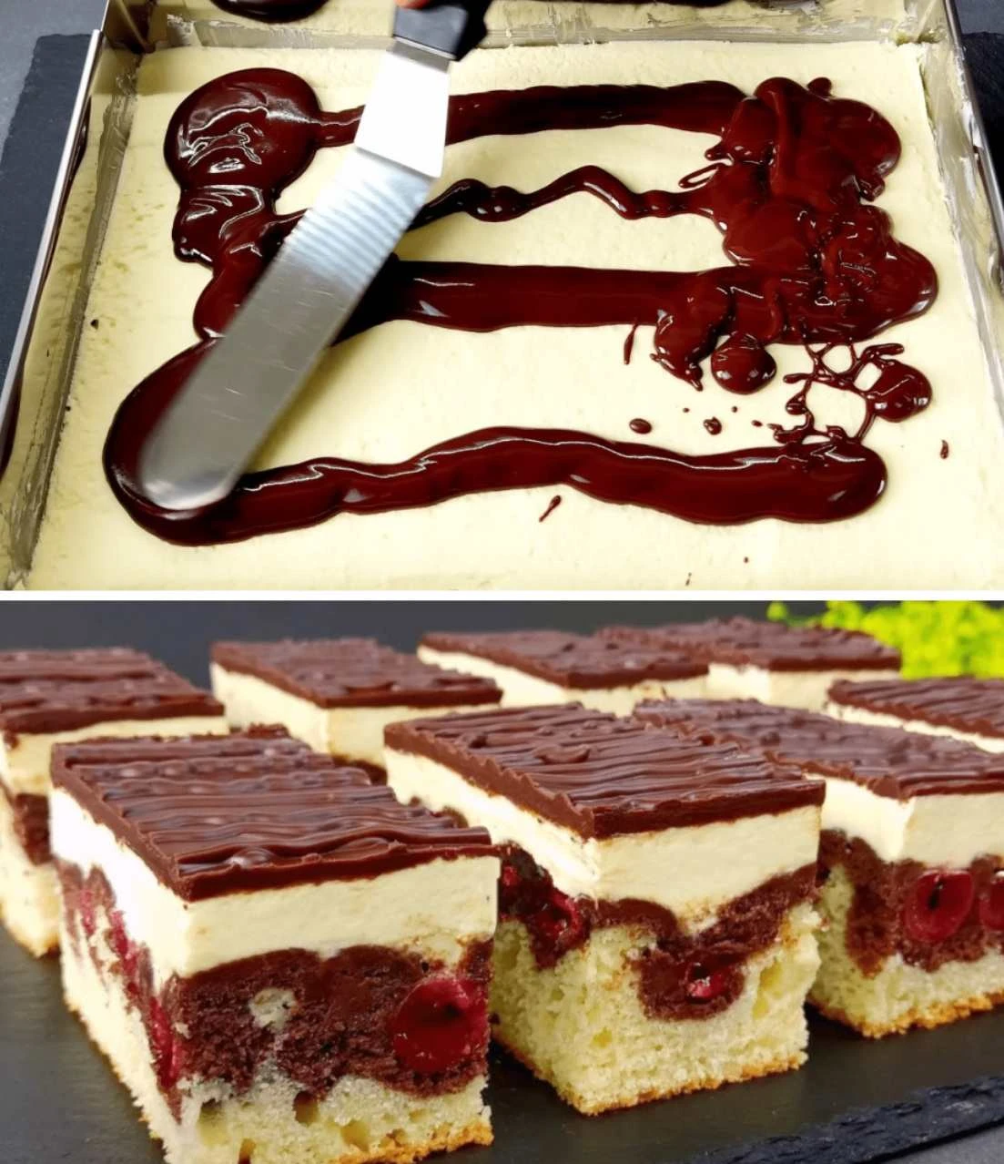 • Příprava těsta: Máslo utřete s cukrem do pěny. Postupně přidávejte vejce, poté mouku smíchanou s práškem do pečiva a mléko. Těsto rozdělte na poloviny – do jedné přimíchejte kakao. Světlé těsto rozetřete na plech s pečicím papírem, na něj kakaové. Navrch rovnoměrně rozložte čerešně nebo višně. Pečte v troubě předehřáté na 180 °C asi 25–30 minut. Nechte zcela vychladnout.