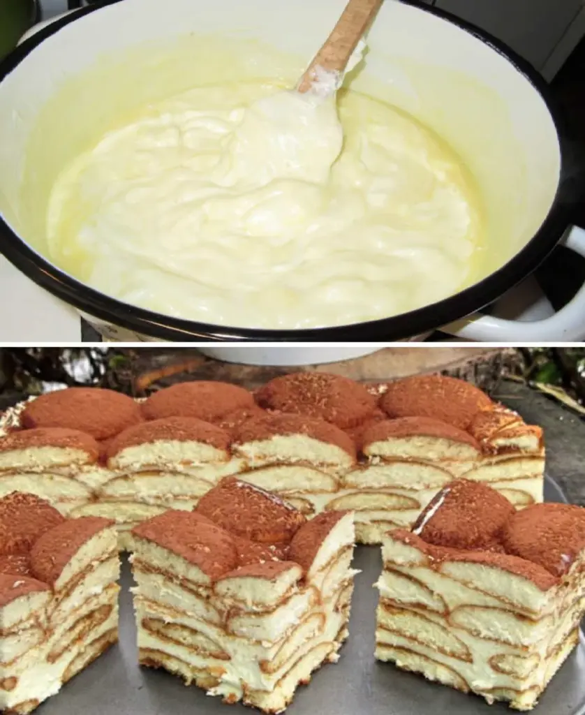 • Vrstevte dezert. Dno formy vyložte piškoty krátce namočenými v kávě (nenamáčejte dlouho, změknou). Rozetřete třetinu krému. Opakujte: piškoty – krém – piškoty – krém – piškoty. Celkem 4 vrstvy piškotů a 3 vrstvy krému, krém končí uvnitř.