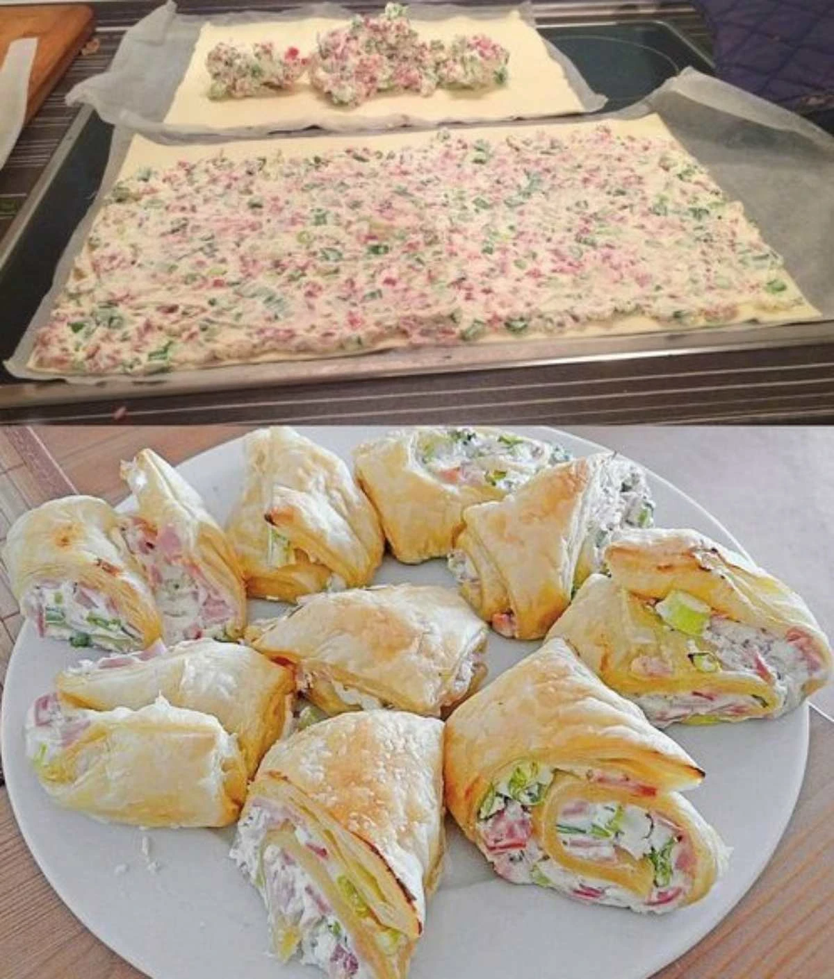 • Vyvaľovanie cesta a plnenie Odpočinuté cesto položte na mierne pomúčený váľ a vyvaľajte ho do obdĺžnika približne 30 × 20 cm. Cesto by malo byť tenké, ale nie priehľadné, aby sa dalo zrolovať, a pritom po upečení pekne chrumkalo. Po celej ploche rovnomerne rozotrite zakysanú smotanu. Posypte opečenou cibuľou a slaninou, dochuťte čerstvo mletým korením a prípadne štipkou muškátového orieška.