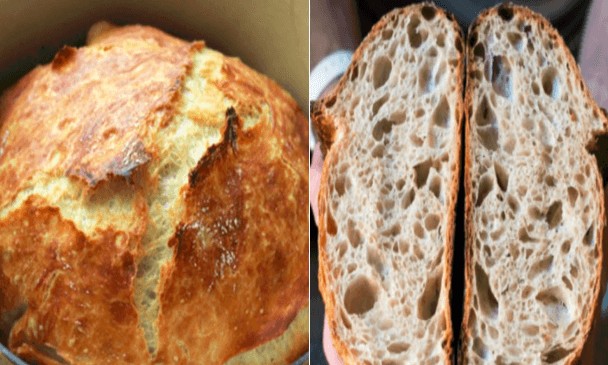 - Pečení chleba: Předehřejte troubu na 220–230 °C a vložte do ní zapékací mísu nebo pekáč s pokličkou, který lze zavřít. Těsto přendejte do horké nádoby, posypte lehce moukou a přikryjte. Pečte přikryté 30 minut, poté sejměte pokličku a pečte dalších 15 minut, dokud nebude mít chléb zlatohnědou kůrku.