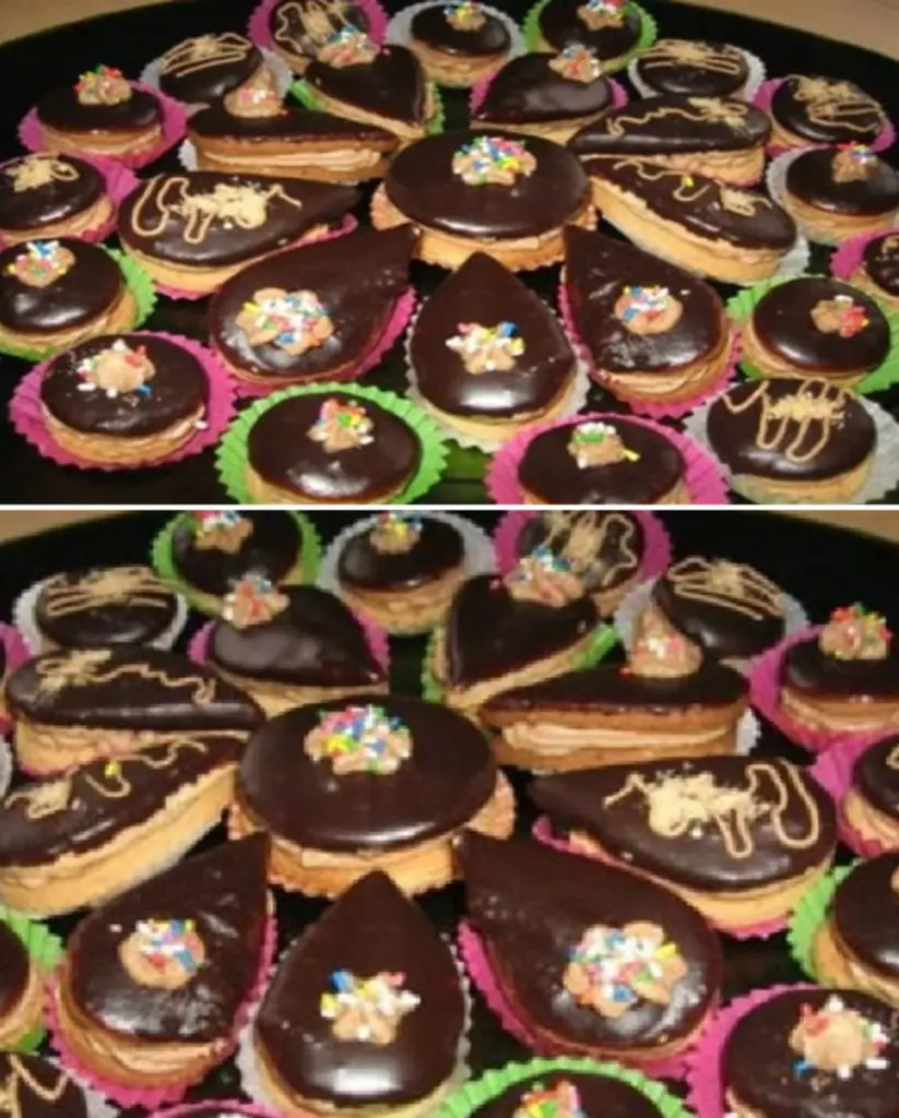 • Slepování a zdobení Na každý vychladlý korpus naneste lžičku krému a přiklopte druhým dílkem. Hotové cukroví namočte vrchní částí do čokoládové polevy a položte na papír ztuhnout. Podle chuti můžete ozdobit ořechem či jemným sypáním.