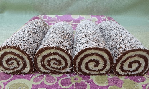 • Chlazení a dokončení: Roládu zabalte do fólie a vložte do lednice na několik hodin, aby dobře ztuhla. Před podáváním nakrájejte ostrým nožem, který průběžně namáčejte do studené vody. Pro ozdobu posypte roládu strouhaným kokosem.