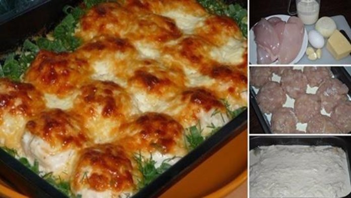 - Příprava masových kuliček: Kuřecí prsa nakrájejte na malé kousky nebo je nasekejte nožem najemno. Přidejte jemně nasekanou cibuli, vejce, sůl a pepř. Vše důkladně promíchejte, aby vznikla hladká směs. Ze směsi tvořte malé kuličky a pokládejte je do tukem vymazané zapékací misky.