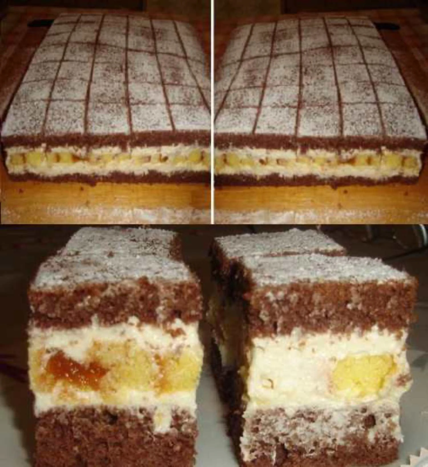 Efektní řezy, které si zamilujete na první ochutnání. Dva kakaové piškotové pláty, uprostřed „šachovnice“ ze světlého rolovaného piškotu s meruňkovým džemem a vše propojuje lehký vanilkový krém. Navrch přijde tmavá poleva s bílou dekorací. Skvělý dezert na oslavy i nedělní kávu.