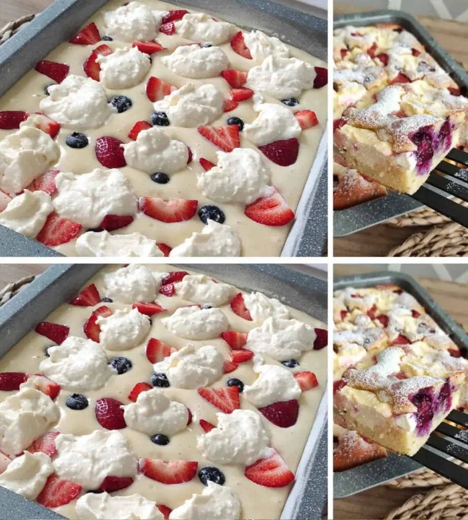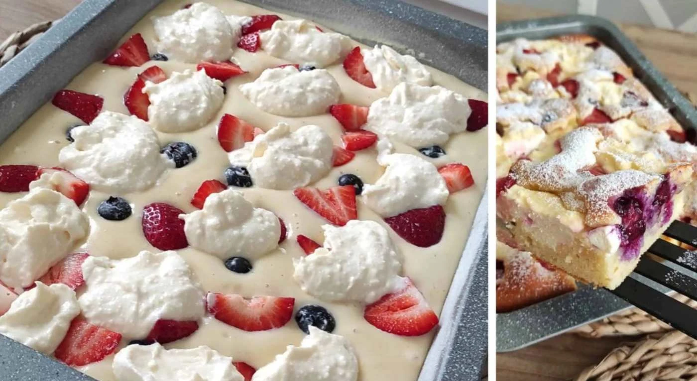 Tahle bublanina s tvarohem spojuje jednoduchost hrnkového stylu s efektem cukrárny. Vzdušné těsto, krémový střed a dvojice ovoce z ní dělají univerzální koláč, který se hodí do každé sezóny. Uložte si recept mezi stálice a obměňujte ovoce podle chuti.