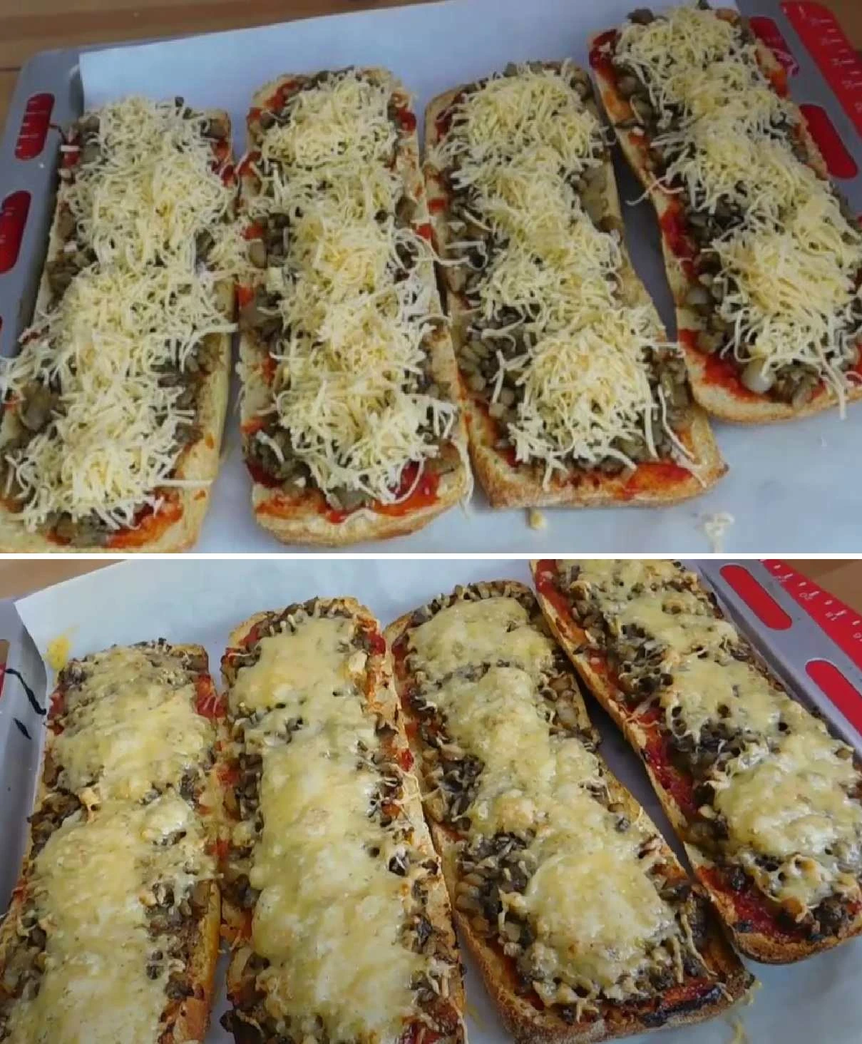 • Na pečivo rovnomerne natrieme šampiňónovú zmes (vrstva cca 3 mm), posypeme nastrúhaným syrom a vložíme do rúry predhriatej na 200 °C. Pečieme 7–10 minút, kým sa syr nerozpustí a okraje pečiva nezhnednú.
