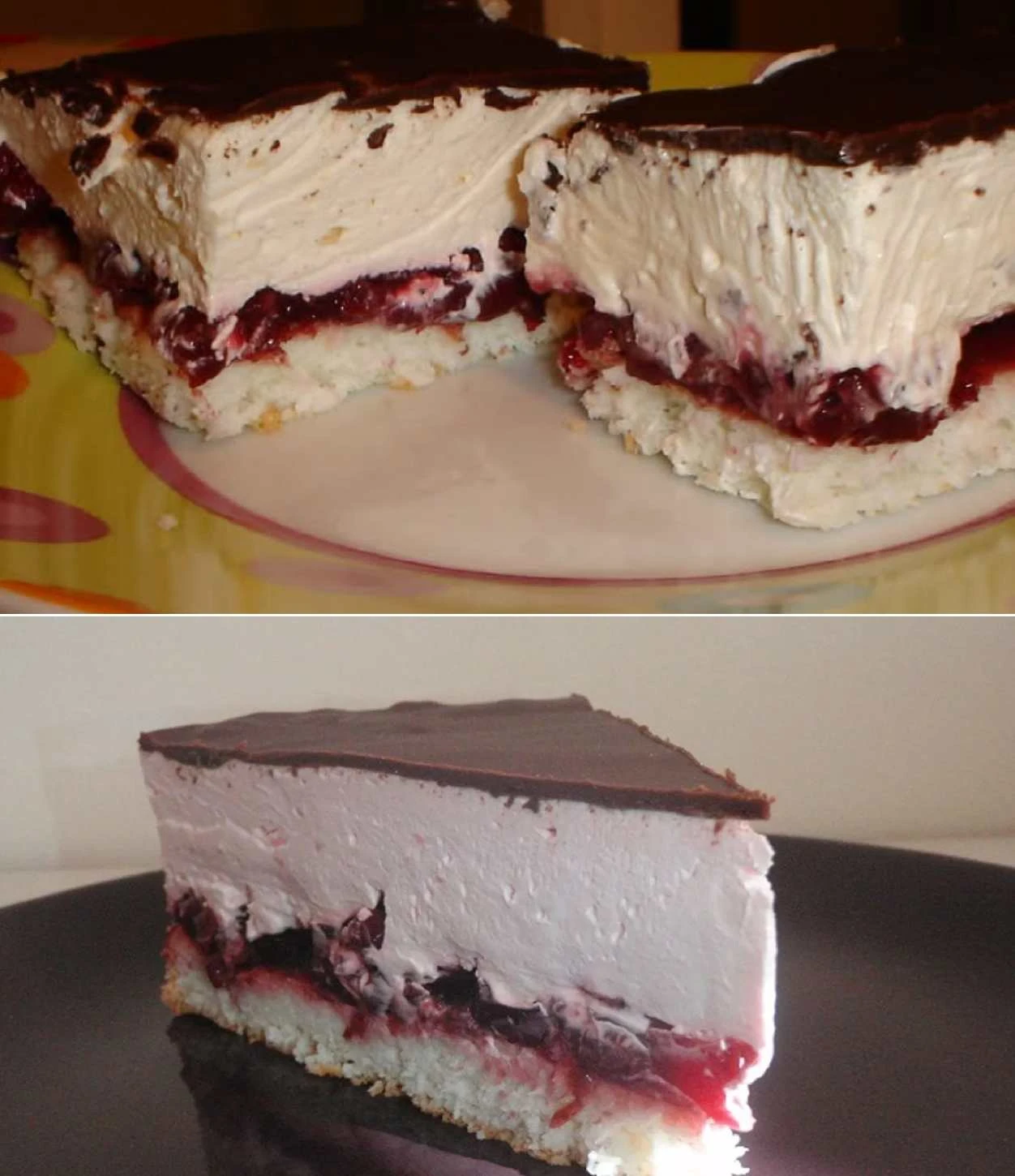 Nebeský koláč s višněmi, kokosovým korpusem a čokoládovou polevou recept