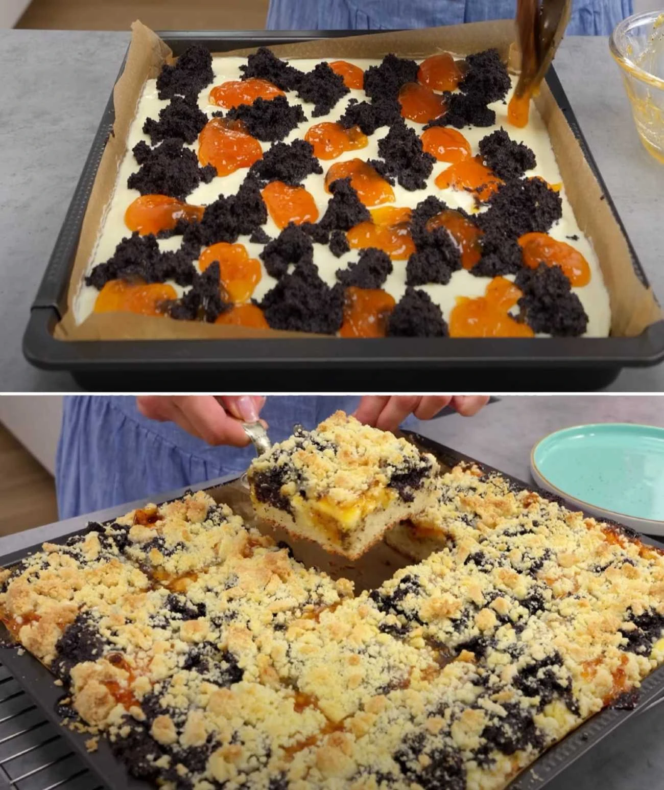 • Skládání koláče: Vykynuté těsto vyválejte na plech vyložený papírem. Rozetřete nejprve tvarohovou, potom makovou náplň. Potřete meruňkovým džemem a vysypte drobenkou.