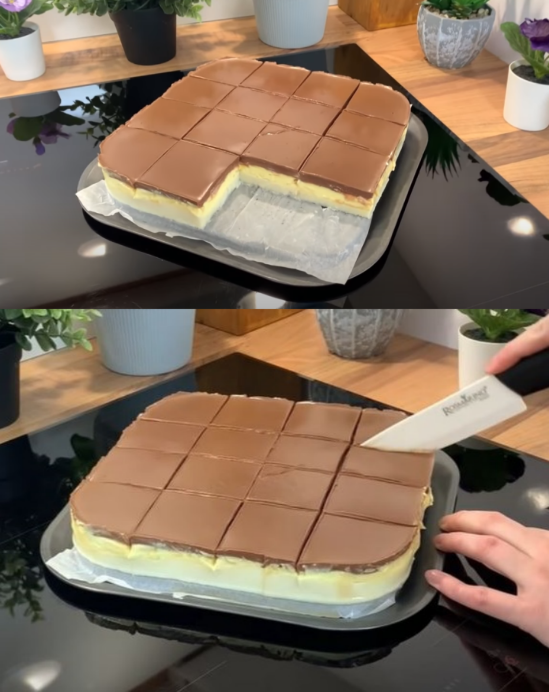 • Čokoládová poleva: V hrnci ohřejte smetanu ke šlehání (250 ml), přidejte nalámanou čokoládu a míchejte do úplného rozpuštění. Nechte mírně zchladnout a nalijte na krémovou vrstvu.