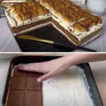 Rychlý dezert bez pečení, který zvládnete za pár minut. Vrstvy kakaových sušenek, nadýchaný krém z mascarpone a šlehačky, uprostřed sametový kajmak (karamelizované kondenzované mléko) a na vrchu namočené cukrářské piškoty s čokoládovou polevou. Stačí dát přes noc vychladit a máte hotový slavnostní zákusek.