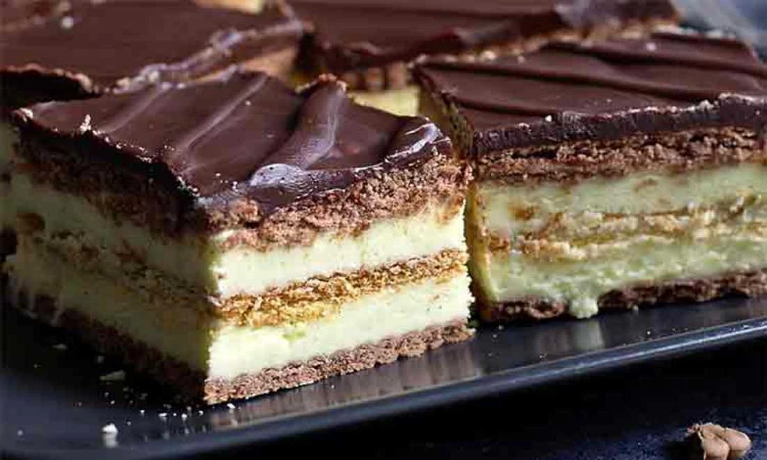 Nepečený sušenkový koláč s vanilkovým krémem a čokoládovou polevou recept