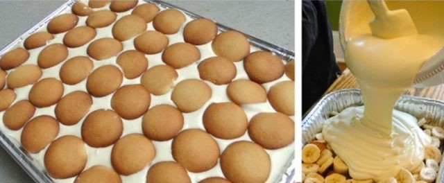 • Sestavení dezertu: Hotový krém naneste na vrstvu banánů a uhladíte. Na vrch opět přidejte vrstvu piškotů.