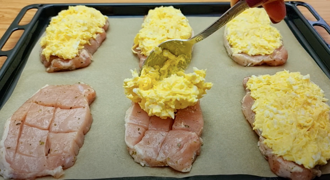 • Pečení: Předehřejte troubu na 180 °C. Plech vyložte pečicím papírem a rozložte na něj připravené plátky masa. Každý plátek potřete připravenou vajíčkovou směsí.
