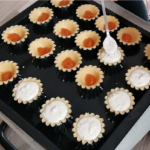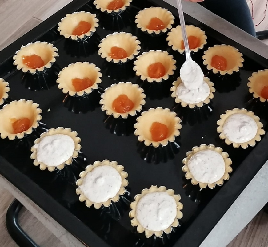 • Plnění: Na dno každého košíčku dejte lžičku meruňkového džemu a poté ho překryjte vrstvou ořechové náplně.