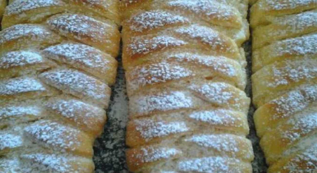 • Tvarování: Každý díl těsta vyválejte do plátu (např. 40 × 25 cm). Delší strany každého plátu nařežte na proužky široké asi 8 cm. Uprostřed plátu rozetřete tvarohovou náplň nebo jablka (dle varianty). Proužky střídavě přehazujte z jedné a druhé strany, čímž vznikne efekt „plicní mřížky“.