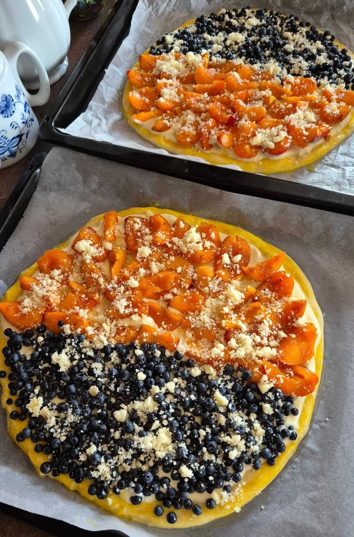 Ovocné koláče z kynutého těsta s tvarohem, meruňkami a borůvkami recept