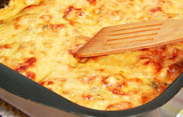 • Příprava brambor: Očistěte a oloupejte brambory. Nakrájejte je na tenké plátky a rozprostřete je na cibuli. Můžete je uspořádat i ve dvou vrstvách, pokud je potřeba. Brambory osolte a potřete zakysanou smetanou.