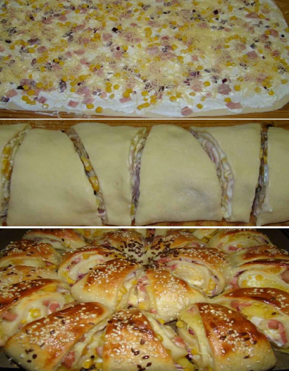 • Příprava náplně Na pánvi bez tuku krátce orestujte nadrobno nakrájenou slaninu, přidejte cibuli a česnek a osmažte dozlatova. Vmíchejte šunku, kukuřici, sůl a pepř, stáhněte z ohně a promíchejte s kysanou smetanou.
