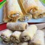 • Vyválět a plnit: Těsto rozválejte na lehce pomoučněném vále na plát cca 3–4 mm. Nakrájejte na proužky (cca 4–5 cm šířka). Na okraj proužku dejte tenkou linku náplně, přeložte přes náplň a dotěsněte. Podélný „váleček“ nožem rozkrájejte na kusy dlouhé 4–6 cm.