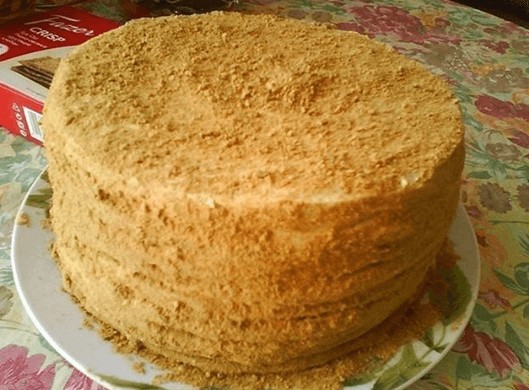 • Příprava těsta: Vejce našlehejte s cukrem do pěny. Máslo (100 g) smíchejte s medem a rozehřejte na mírném ohni. Přidejte sodu a vařte, dokud hmota nezíská sytou karamelovou barvu. Sundejte z ohně a ještě minutu míchejte. Postupně vmíchejte vaječnou hmotu a poté přidejte mouku. Vzniklé těsto dobře zamíchejte.
