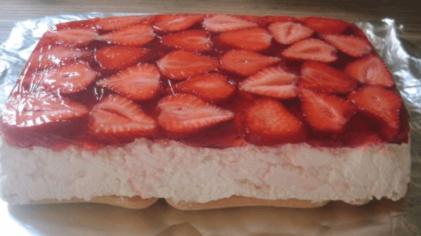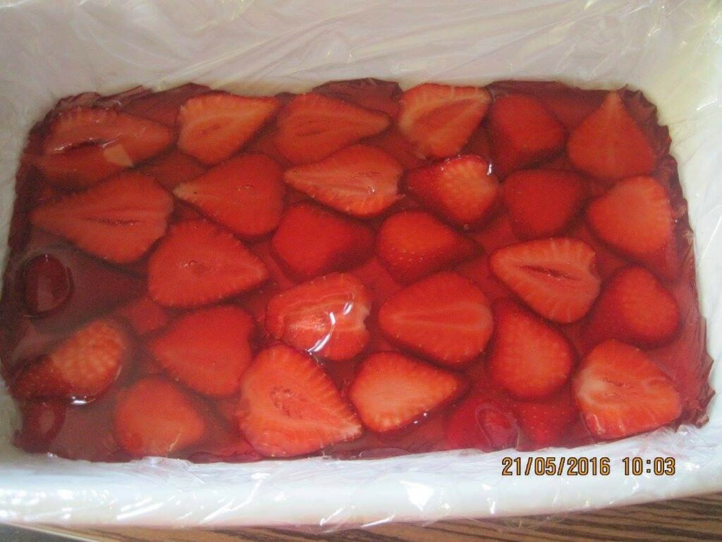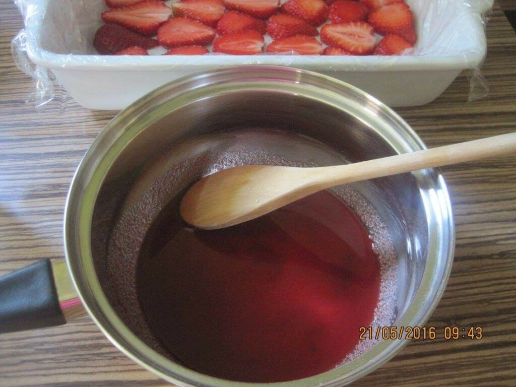 • Zalijte jahody želatinou: Připravenou želatinu nalijte na vrstvu jahod. Poté dejte mísu do lednice, aby želatina ztuhla.