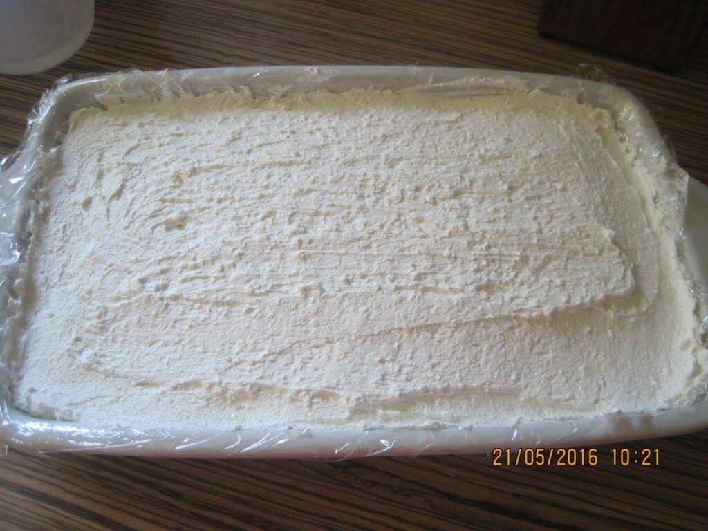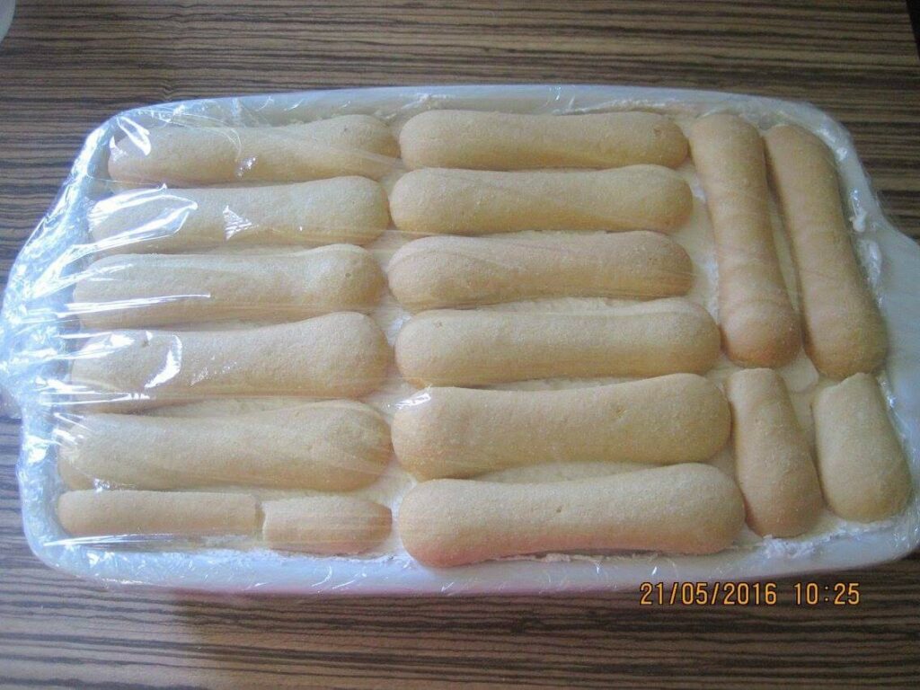 • Vrstva piškotů: Na tvarohovou vrstvu položte piškoty a jemně je přitlačte. Dezert přikryjte fólií a vložte na několik hodin do lednice, aby se propojily chutě.
