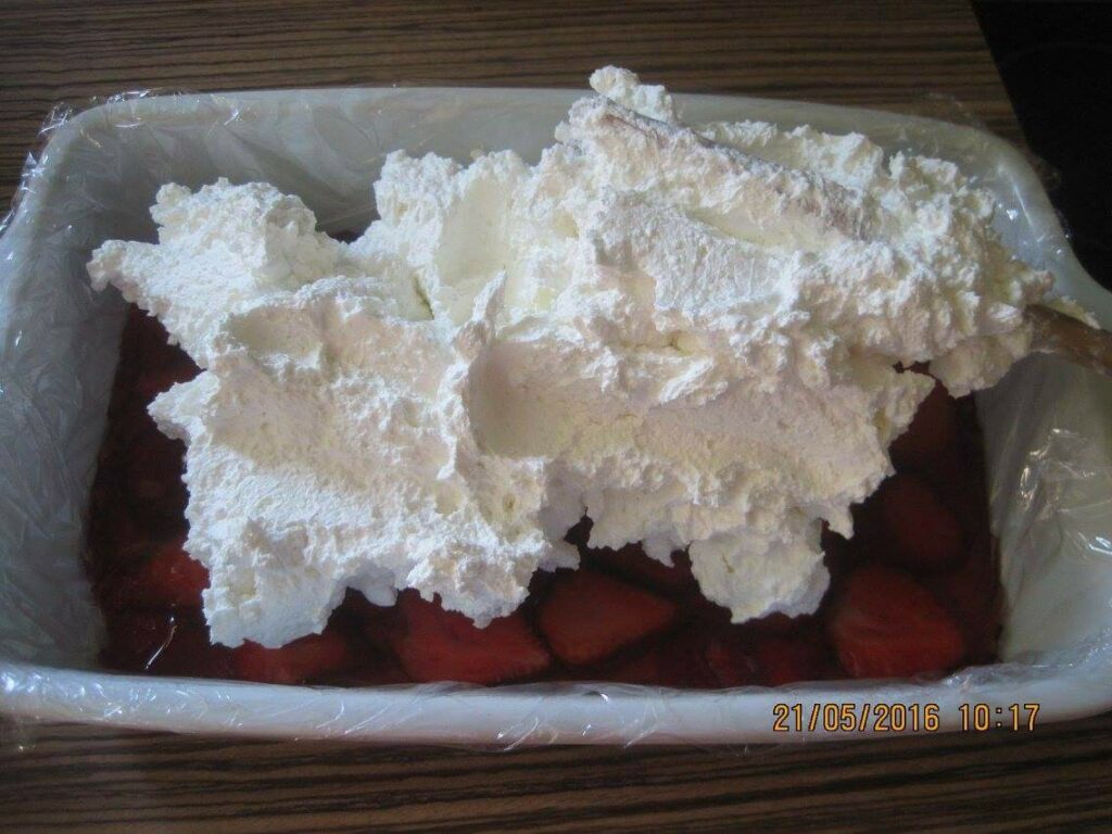 • Přidejte tvarohovou vrstvu: Na ztuhlou želatinu s jahodami naneste tvarohový krém. Uhlaďte ho do roviny.