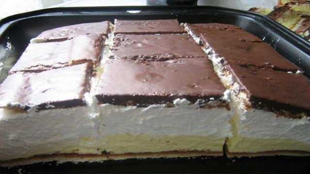 - Příprava čokoládové polevy Ve vodní lázni si rozpustíte čokoládu spolu s lžící oleje. Hotovou čokoládou potřete vychladlé listové těsto, které vytvoří spodní vrstvu dezertu.