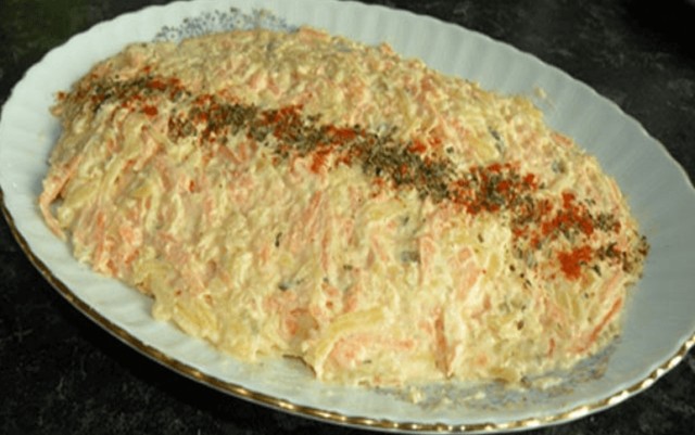 - Příprava zeleniny: Brambory uvaříme ve slupce, necháme vychladnout a poté nastrouháme na struhadle nebo protlačíme přes síto jako na klasický bramborový salát. Mrkev krátce povaříme, necháme vychladnout a také nastrouháme (pokud chcete, můžete použít i nakládanou mrkev zbavenou nálevu).