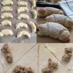 • Tvarování: Těsto rozdělte na 3–4 stejné díly. Vždy pracujte jen s jedním (zbytek nechte v chladu). Vyválejte kruh o síle cca 3 mm, rozkrájejte na 8–12 trojúhelníků. Na delší stranu dejte lžičku náplně, sviňte ke špičce a jemně zahněte do tvaru rohlíčku. Konce můžete přimáčknout.