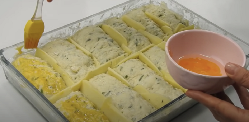 • Tvarování chleba Vykynuté těsto přendejte na máslem vymazaný plech. Rukama namazanýma olejem vytvořte v těstě zářezy a do nich vložte plátky sýra.