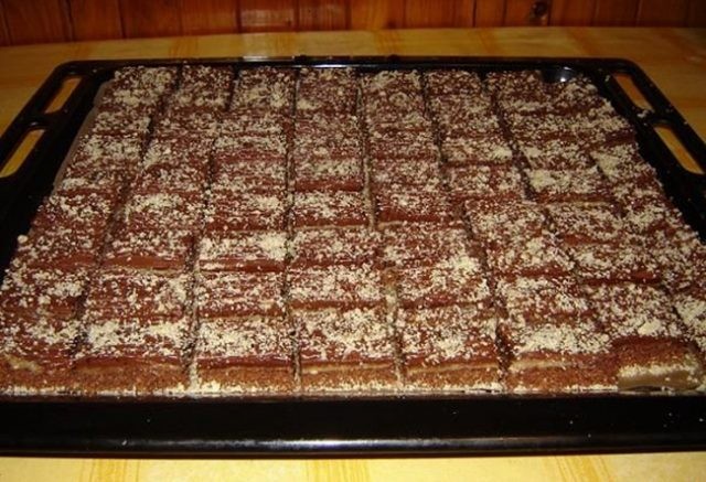 • Čokoládová poleva: Ve vodní lázni rozpustíme čokoládu na vaření se ztuženým tukem. Nechte trochu zchladnout, poté nalijte na druhou vrstvu krému a rovnoměrně rozetřete.