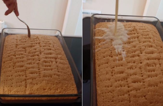 • 4. Dokončení: Po upečení nechte těsto lehce vychladnout a vidličkou ho důkladně propíchejte, aby krém dobře prosákl. Poté na těsto nalijte připravený krém, zakryjte plech alobalem a nechte dezert ztuhnout přes noc v chladničce.