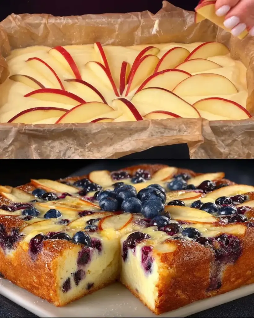 Tvarohový koláč s jablky a borůvkami: nadýchaný, šťavnatý a jednoduchý recept