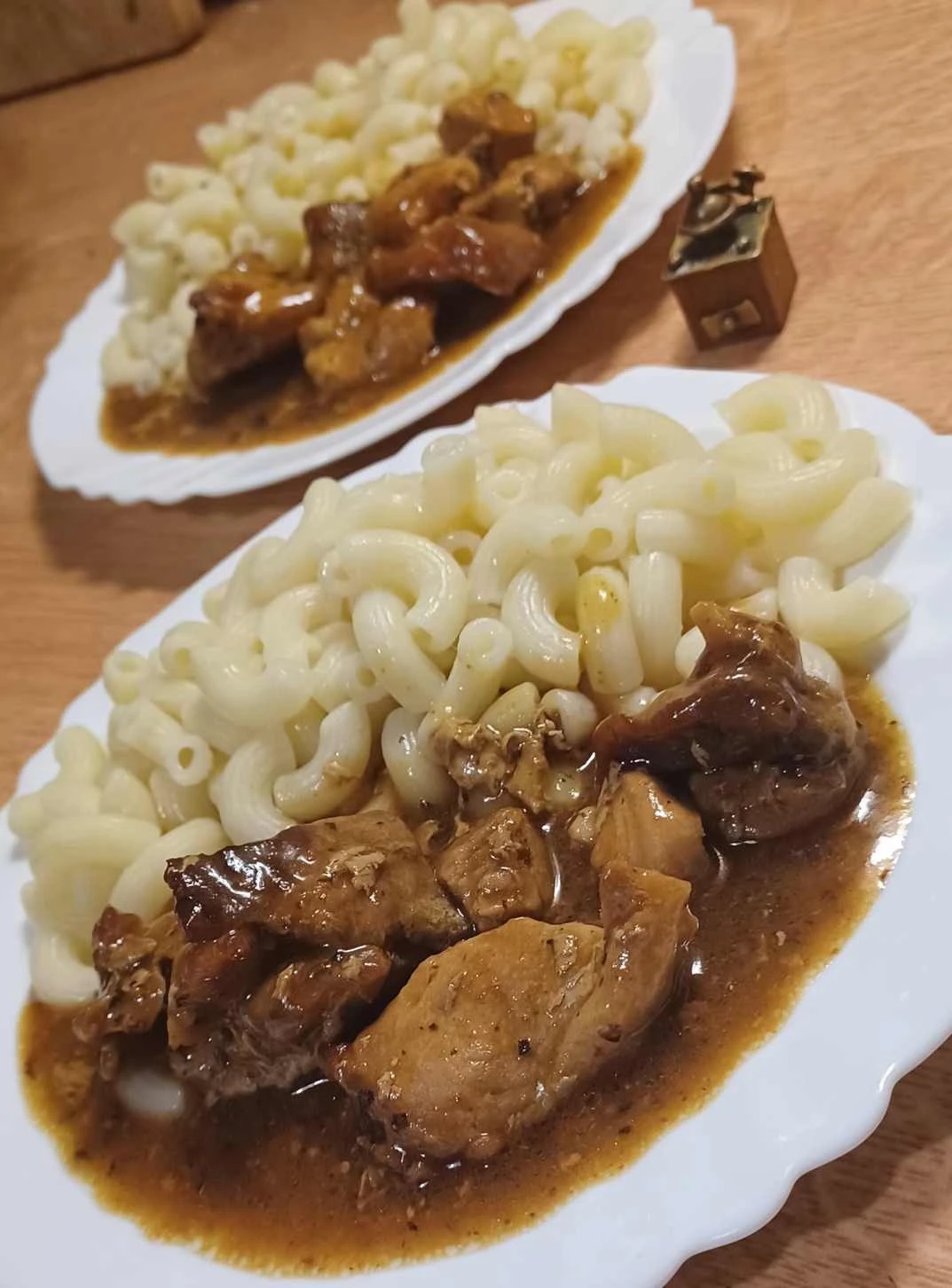 • Důkladné dopečení Obsah pánve přesuňte do pekáče (nebo ponechte v pánvi vhodné i do trouby), podlijte trochou vody, přikryjte a pečte v troubě předehřáté na 160 °C zhruba 90 min, dokud maso nebude měkké téměř rozpadavé.